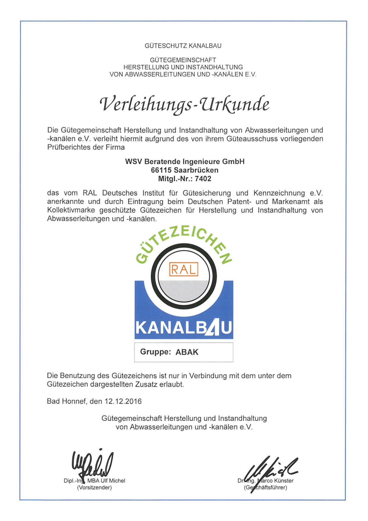 Die Gütegemeinschaft Herstellung und Instandhaltung von Abwasserleitungen und -kanälen e.V. hat im Dezember 2016 unserem Unternehmen das Gütezeichen Kanalbau der Beurteilungsgruppe ABAK (Ausschreibung und Bauüberwachung von Maßnahmen der Verlegung und Prüfung von Abwasserleitungen und -kanälen in offener Bauweise) verliehen.