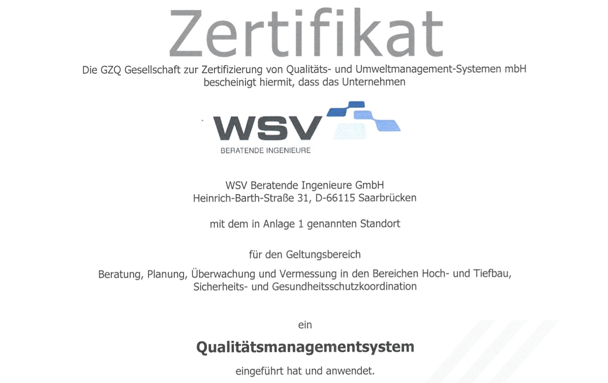 Im November 2016 wurde die WSV Beratende Ingenieure GmbH nach DIN EN ISO 9001:2015 zertifiziert.
