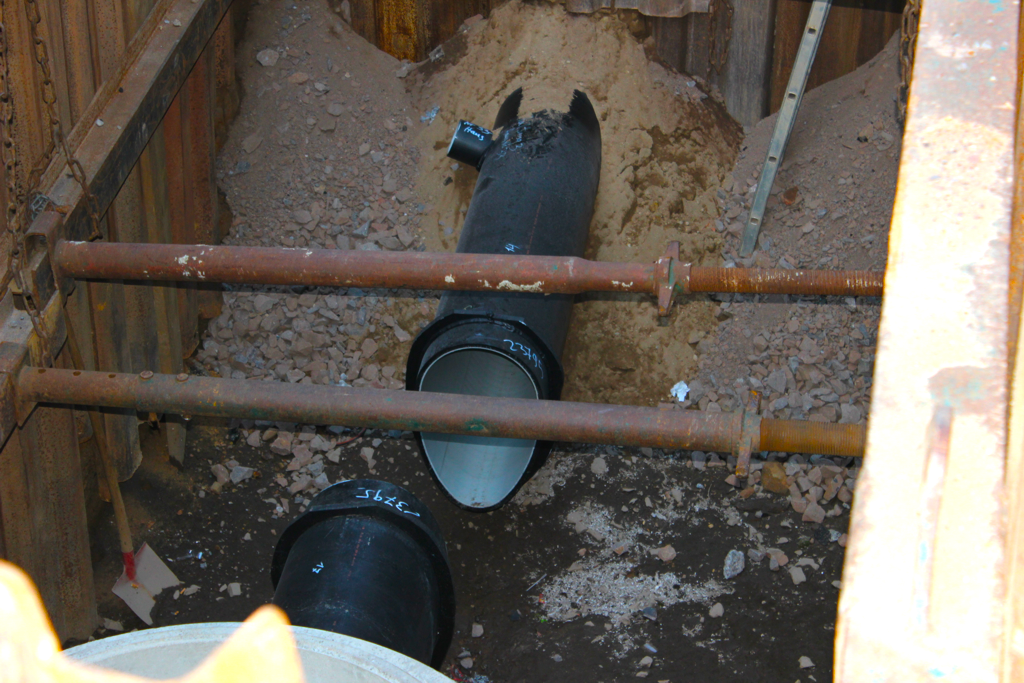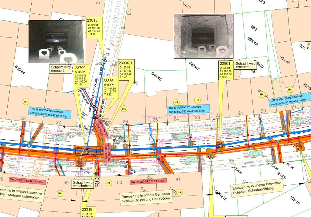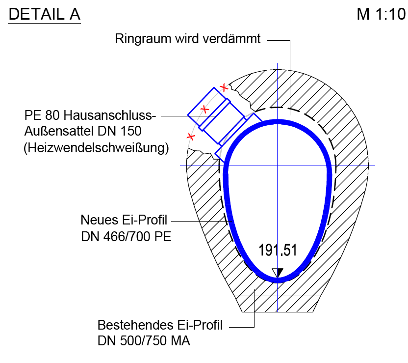 Um Verkehrsbehinderungen zu minimieren, werden die Regenwasserkanäle im gesamten Bereich in geschlossener Bauweise saniert. Neue Kanalrohre aus hochdichtem Kunststoff werden unterirdisch in die alten Ei-Profile eingezogen.