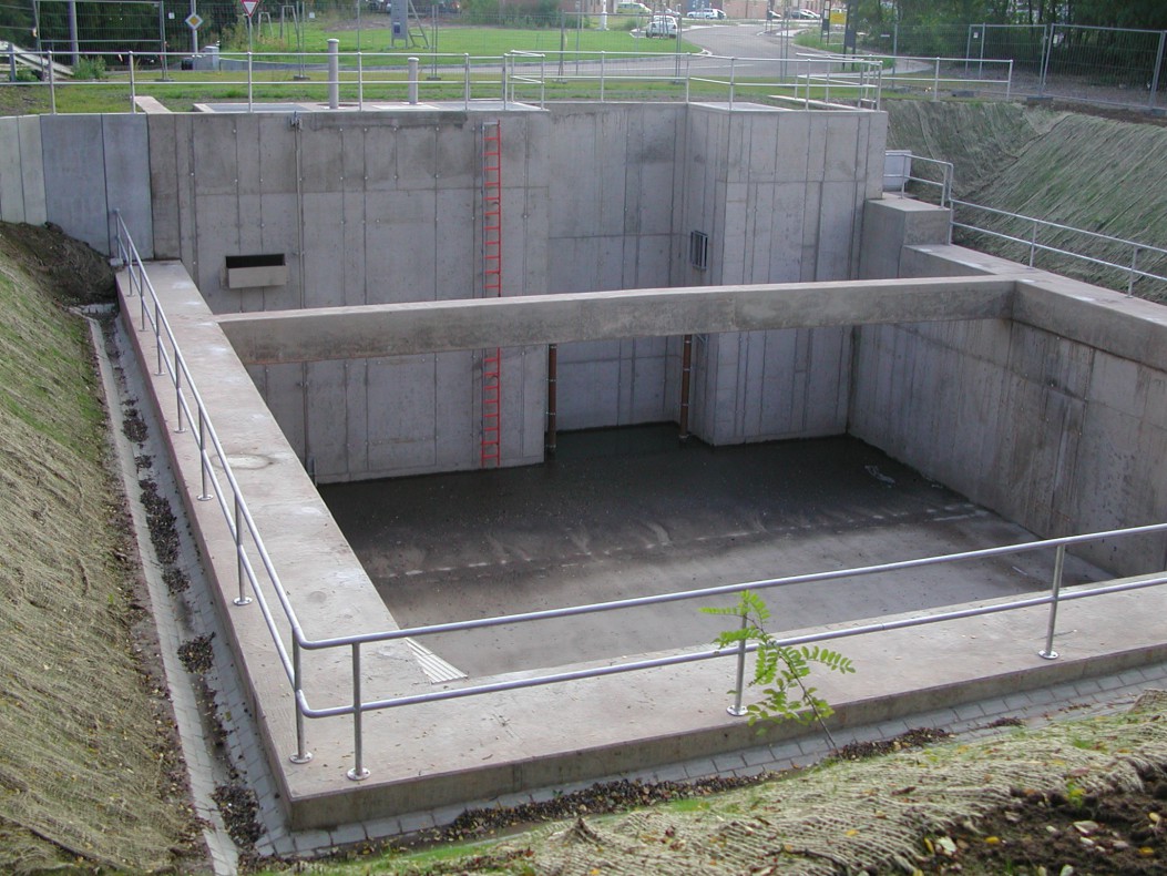 Zur Speicherung der im Ostteil des Gewerbegebiet “Ehemaliges Ausbesserungswerk Burbach” anfallenden Regenwassermengen wurde ein technisches Regenrückhaltebecken errichtet.