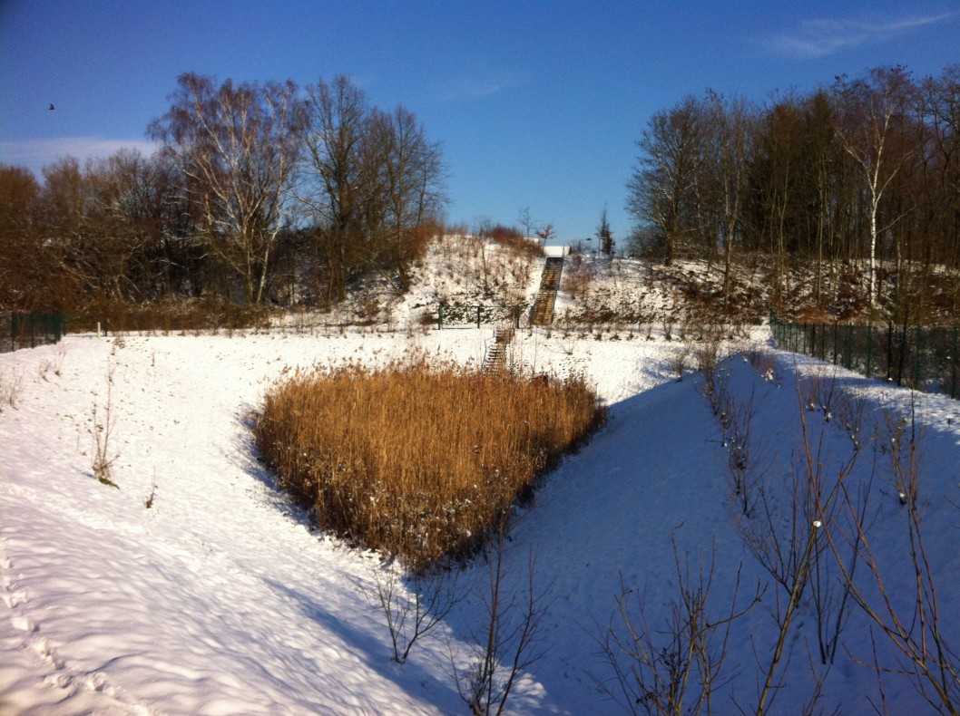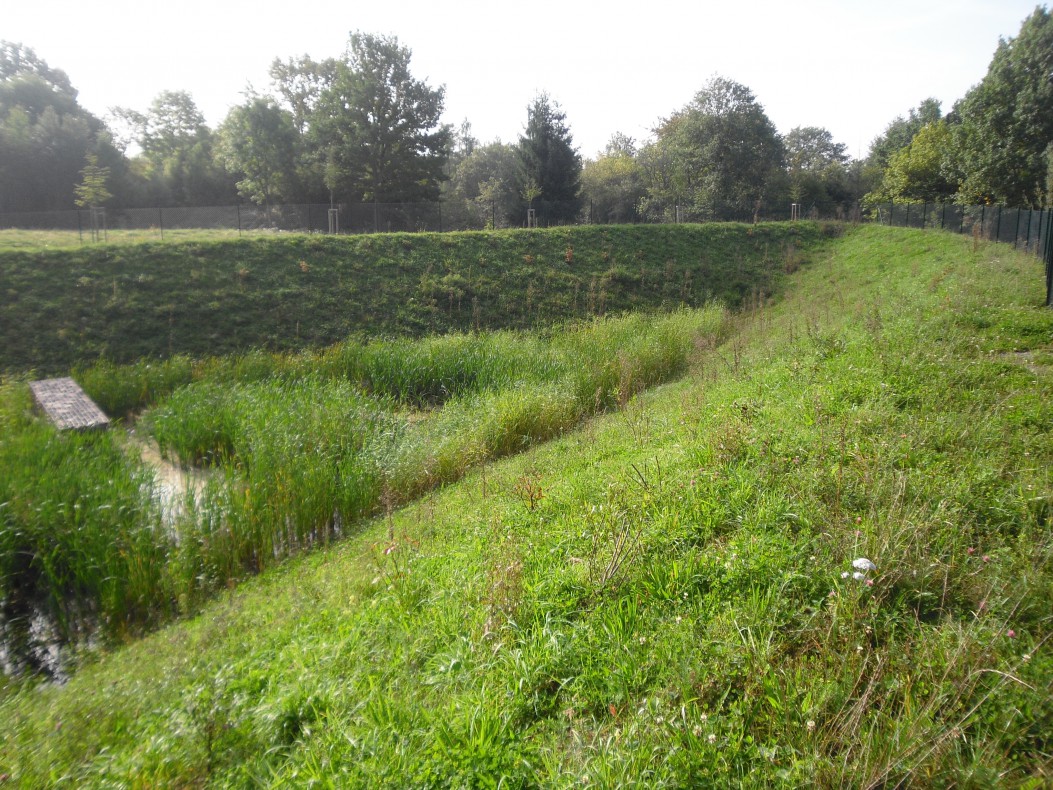 Aufgrund der beengten topogafischen Verhältnisse konnte das Becken nicht komplett eingegraben werden. Zum Gewässer hin musste eine Dammschüttung erfolgen.