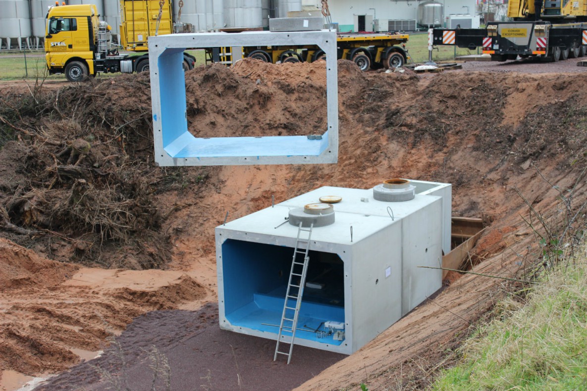 Die Anlage wurde als Durchlaufbecken im Hauptschluss konzipiert. Zur Anwendung kam ein Stahlbetonfertigteilbecken mit einer Länge von 12,00 m, einer Breite von 4,05 m und einer Tiefe von 3,29 m.