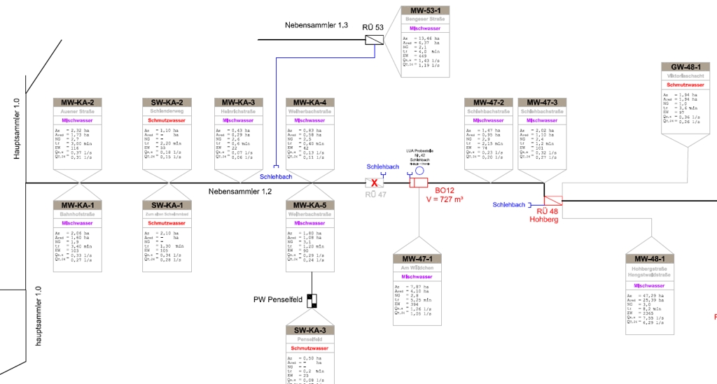 Zielsetzung dieser Schmutzfrachtberechnung ist die Optimierung der Becken- und Regenüberlaufstandorte der bestehenden Bauwerke RÜ 47 und RÜ 48 im Hinblick auf die heutigen Berechnungsansätze und Rahmenbedingungen sowie den zu verbessernden Hochwasserschutz.