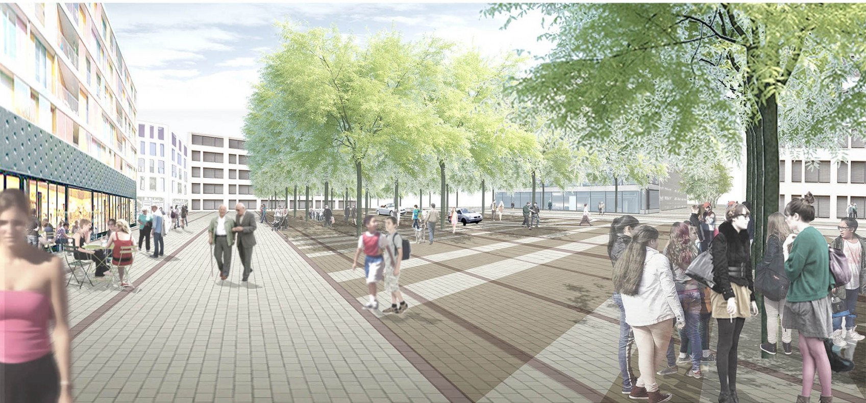 Die Roonstraße wird durch Definition neuer Raumkanten und Baufelder zum grünen Herz des Viertels und bricht die starke, verkehrsgeprägte Achse der Westspange zugunsten des Heuduckboulevards.