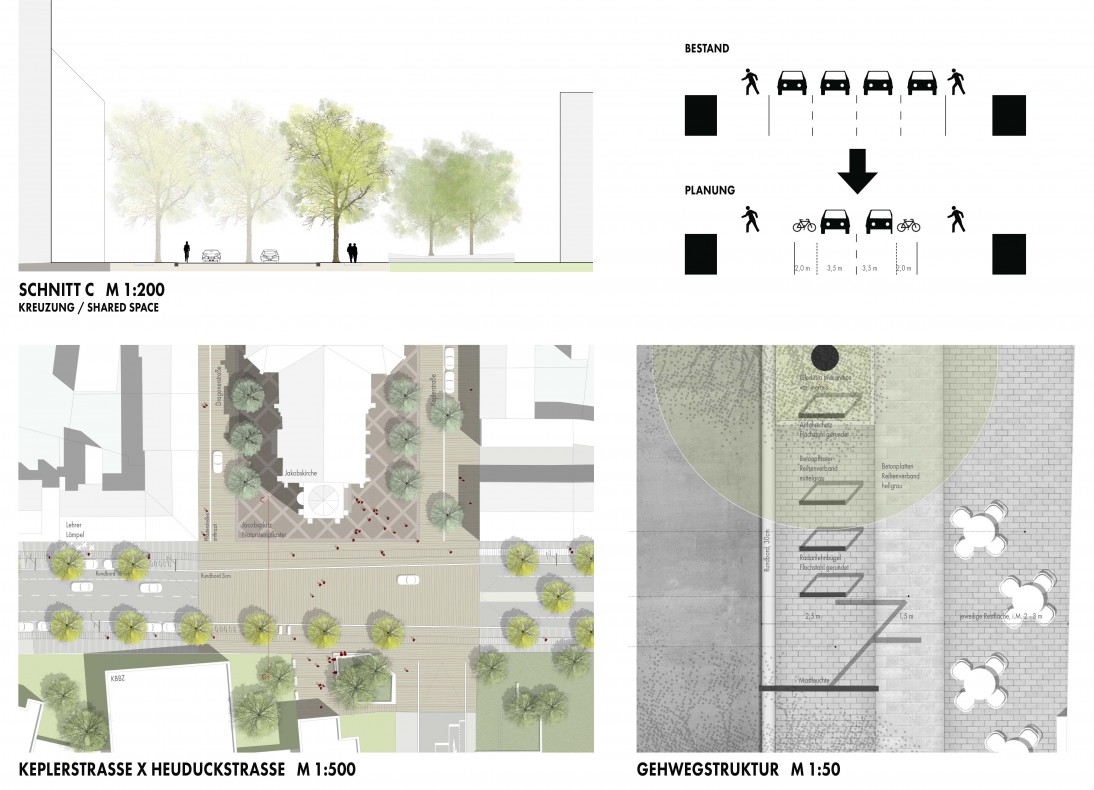 Die verknüpfenden Leitelemente des Freiraumes mit städtebaulicher Relevanz sind in Ost-West Richtung der neugestaltete Heuduckboulevard als Verbindungsachse, der neue Roonpark und das grüne Band zwischen Ministerium und HTW, sowie in Nord-Süd-Richtung der Roonplatz und die querenden Wohnstraßen. Der Diversität der Bebauung werden klare Linien und Formen entgegengesetzt, die das Gebiet vereinen und mit der Erhöhung des Grünvolumens auf die Herausforderungen des Klimawandels reagieren.